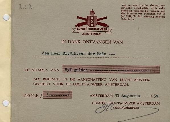 Een op grijs papier met paars gedrukt ontvangstbewijs voor het bedrag van 5 gulden van het Comité Luchtafweer Amsterdam. Op de kaart staat het embleem van het Comité Luchtafweer en de tekst: 'In dank ontvangen van' met de naam W. M. van der Made en datum: Amsterdam 31 augustus 1939. Op de achterkant van de kaart is een biljet van de "Verzamelgiro" geplakt. Deze verzamelgiro geeft restitutie van het hiervoor genoemde bijdrage van 5 gulden aan de schenker Dr. W.M. van der Made en gedateerd: 10 juni 1940