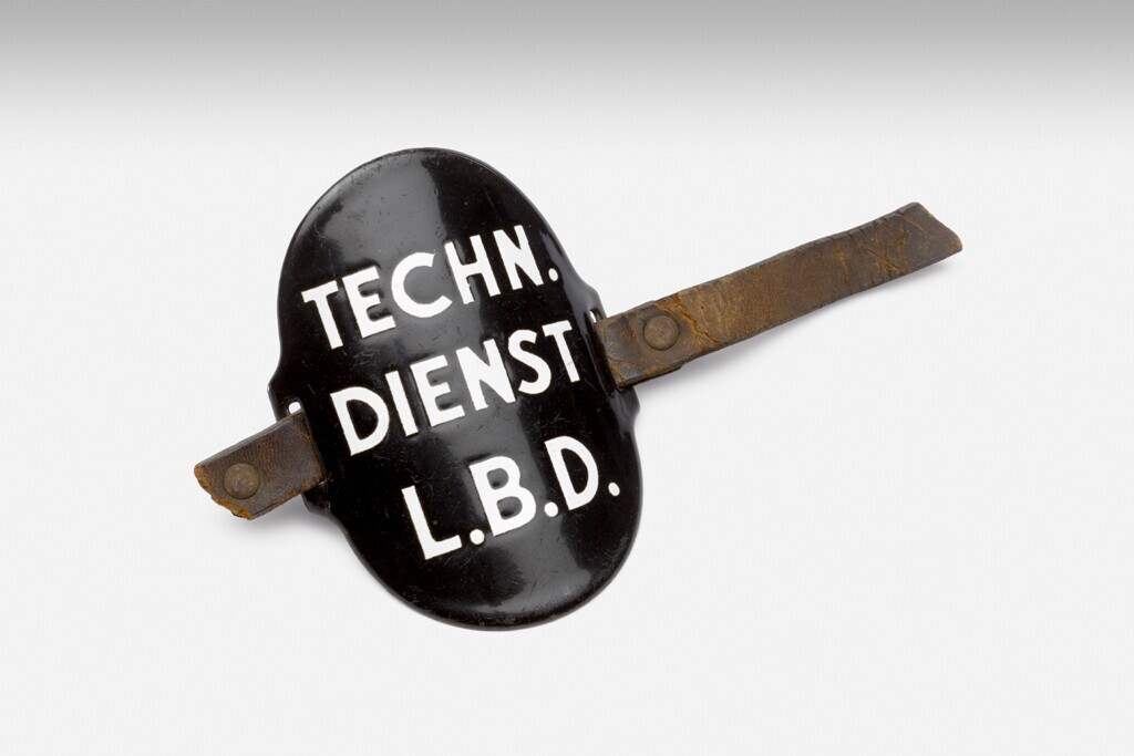Een ovaal zwart en wit geëmailleerd metalen badge voorzien van twee riempjes om rond de arm te dragen. Op de badge in witte letters op zwart: 'Tech. Dienst L.B.D.'