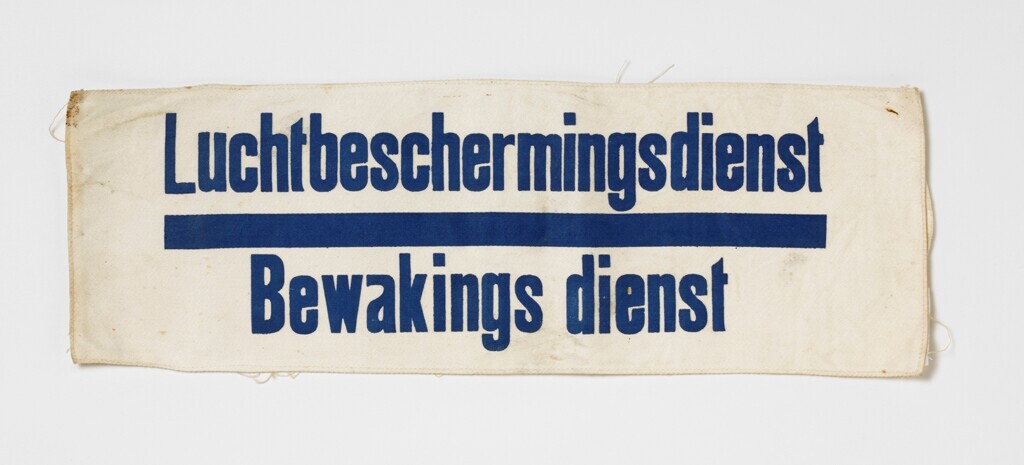 Een witte katoenen mouwband met blauwe opdruk: 'Luchtbeschermingsdienst - Bewakingsdienst'.