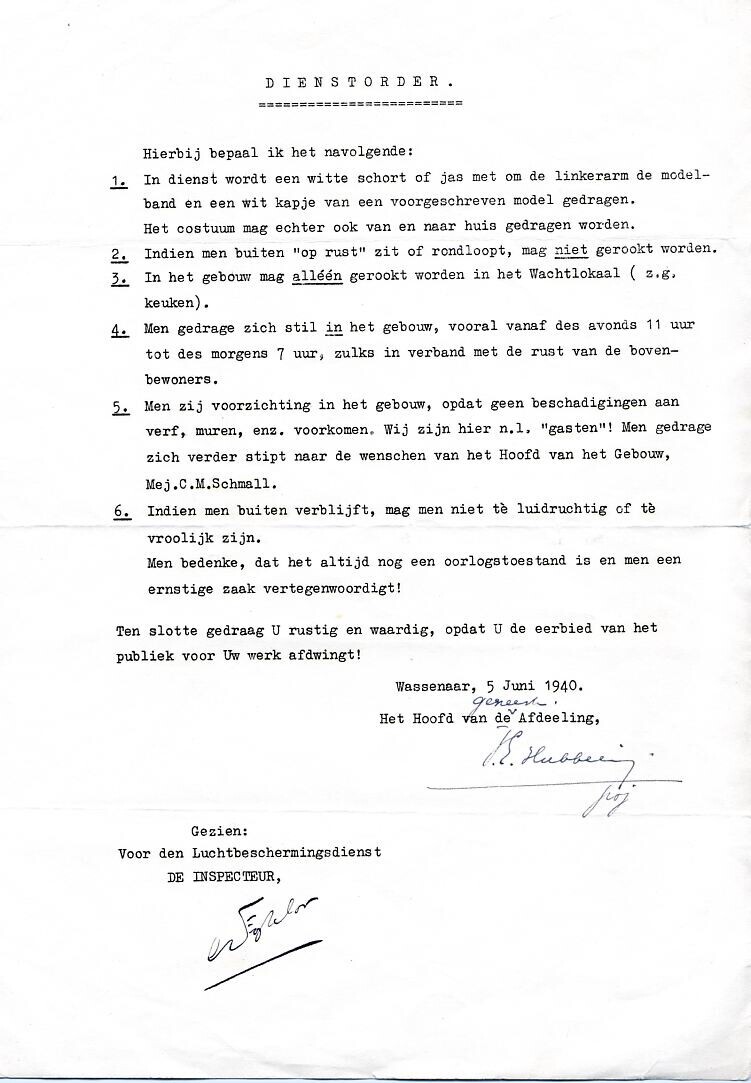 Een dienstorder met zes gedragsregels hoe te gedragen in een gebouw dat beschikbaar is gesteld voor de Luchtbeschermingsdienst Wassenaar. Afsluitend: "Ten slotte gedraag U rustig en waardig, opdat U de eerbied van het publiek voor Uw werk afdwingt!"