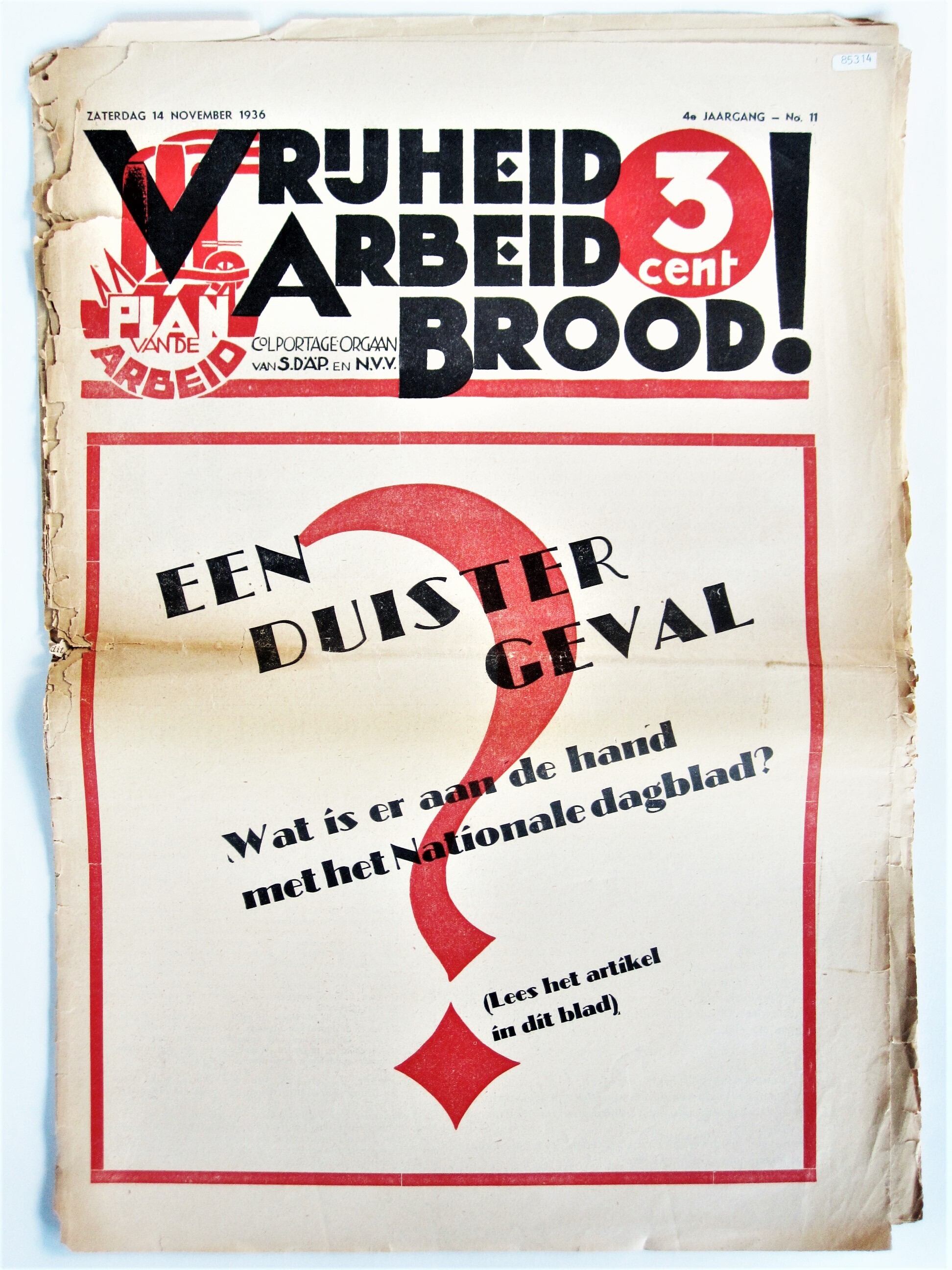 Exemplaren van het periodieke orgaan ''Vrijheid Arbeid Brood! Colportage-orgaan der S.D.A.P.'' Het betreft de nummer 10, 11, 12, 14, 39, 40 en 41 uit de periode 7 november 1936 tot en met 12 juni 1937. De krant stond onder redactie van o.a. Koos Vorrink.<br>Vrijheid, Arbeid, Brood werd tot 1940 uitgegeven. Het blad streed tegen communisme en fascisme tegelijk en waarschuwde al vroeg tegen Adolf Hitler. Ruim 7000 vrijwilligers verspreidden het blad huis aan huis. De oplage bedroeg zo’n 100.000 exemplaren.<br>