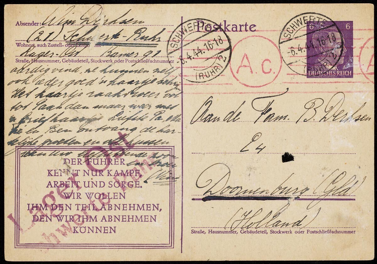Een verzameling van 43 Briefkaarten, door Wim Derksen geschreven vanuit "Lager Ost, Schwerte Ruhr" aan de familie B. Derksen in Doornenburg, Gelderland.