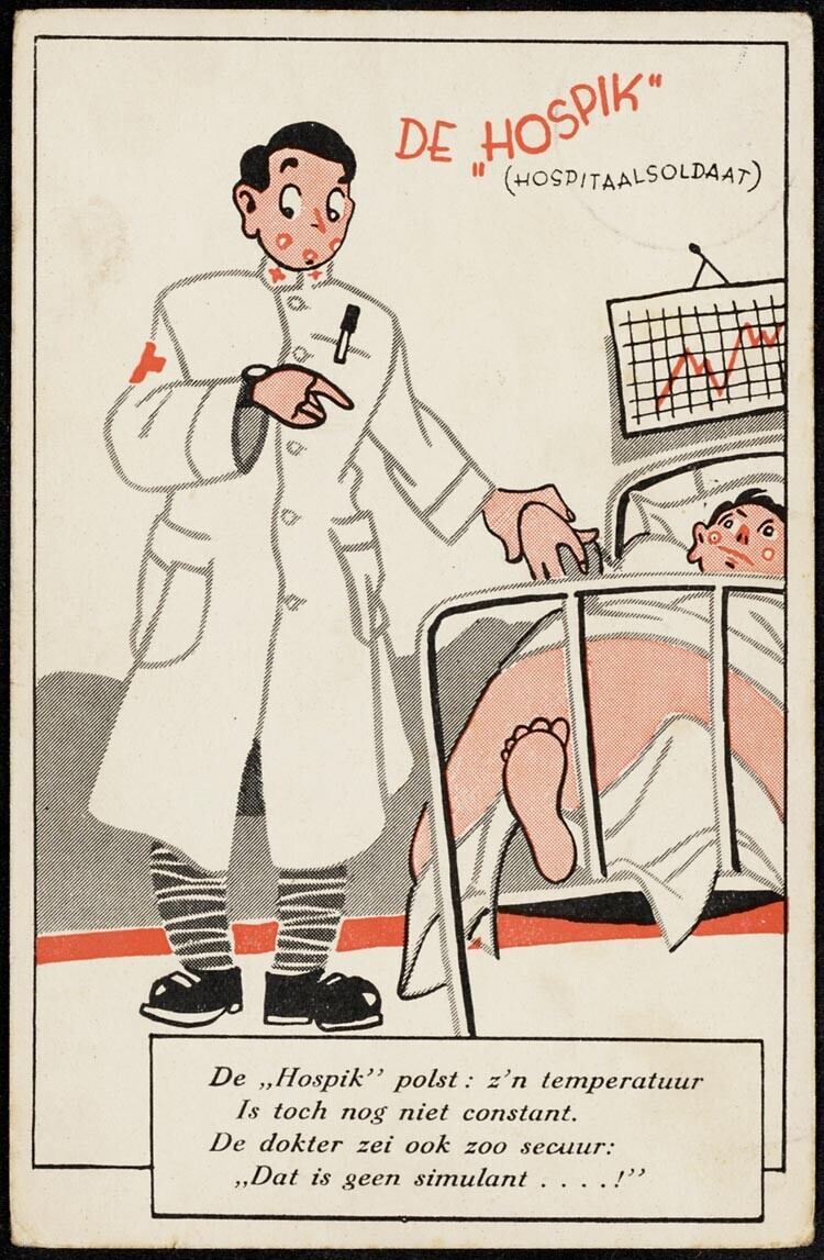 Gebruikte ansichtkaart met een spotprent van een arts aan een ziekenhuisbed. Bijschrift: "De hospik polst: z'n temperatuur is toch nog niet constant. De dokter zei ook zoo secuur: dat is geen simulant'. De achterkant is beschreven.