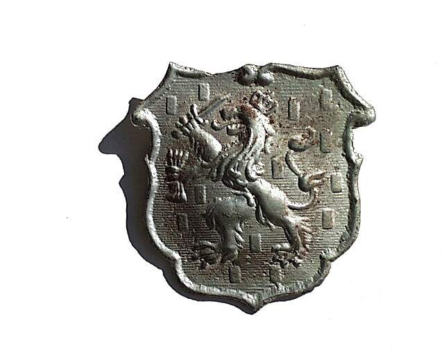 Een metalen speldje in de vorm van het Nederlandse Rijkswapen met klimmende Nederlandse Leeuw.