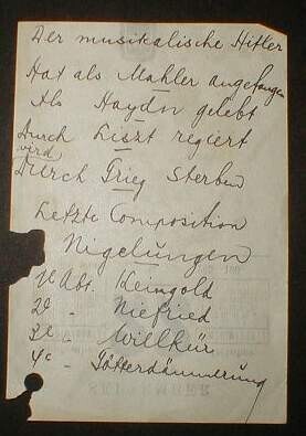 Een blad uit een Nederlandse kalender met daarop geschreven: "Der musikalische Hitler. Hat als Mahler angefangen. Als Haydn gelebt. Durch Liszt regiert. Wird durch Grieg sterben. Letzte Composition Nigelüngen. 1e Abt. Kein Gold. 2e Abt. Niefried. 3e Abt. Willkür. 4e Abt. Götterdämmerüng".