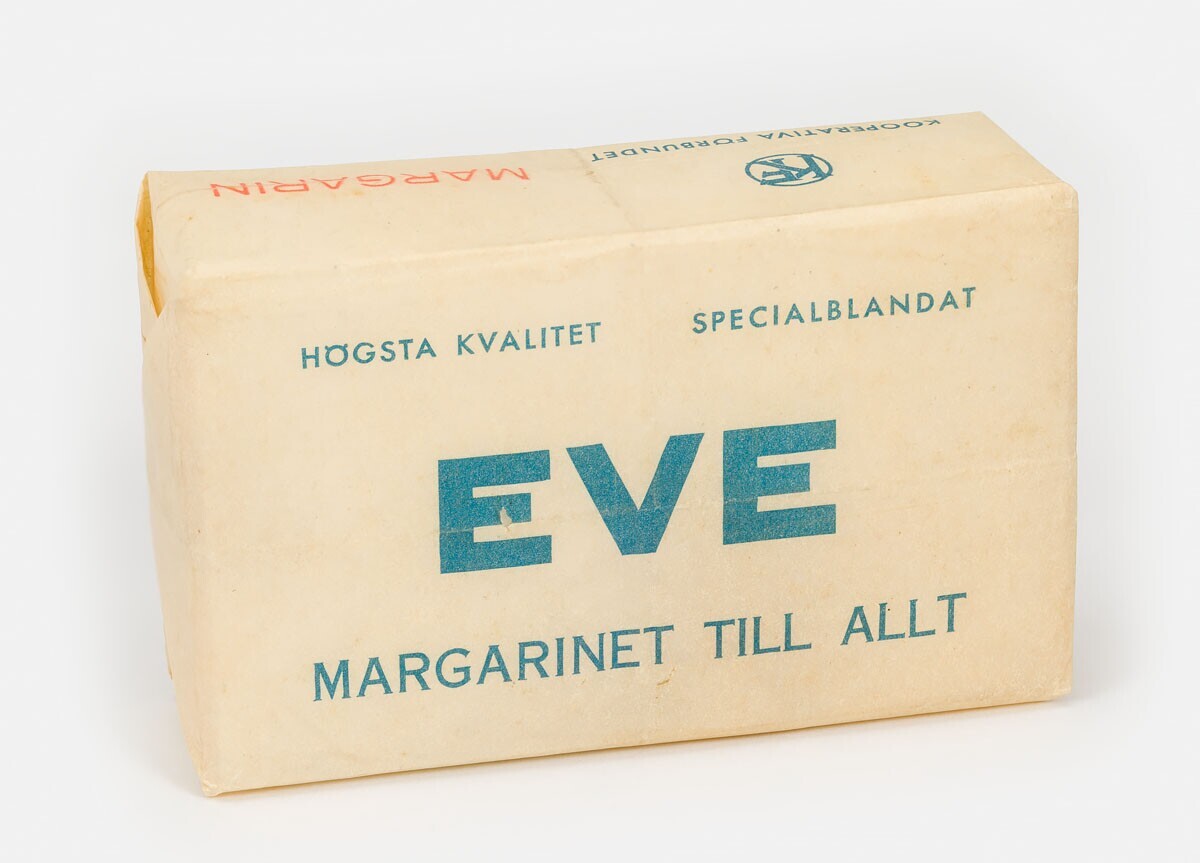 Een wikkel van een pakje Zweedse margarine van het merk 'Eve'. Voedselhulp uit het neutrale Zweden.