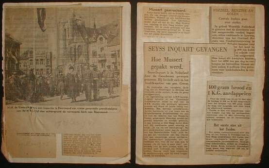 Twee bladen aan beide kanten beplakt met krantenknipsels met berichten over de bevrijding van Nederland.