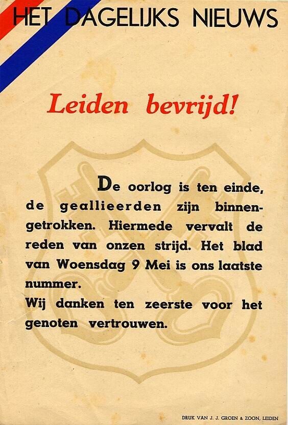 Pamflet over de bevrijding van Leiden en de aankondiging van het laatste nummer van ''Het dagelijks nieuws''. In de linker bovenhoek de Nederlandse driekleur. De tekst is gedrukt over het wapen van de stad Leiden.