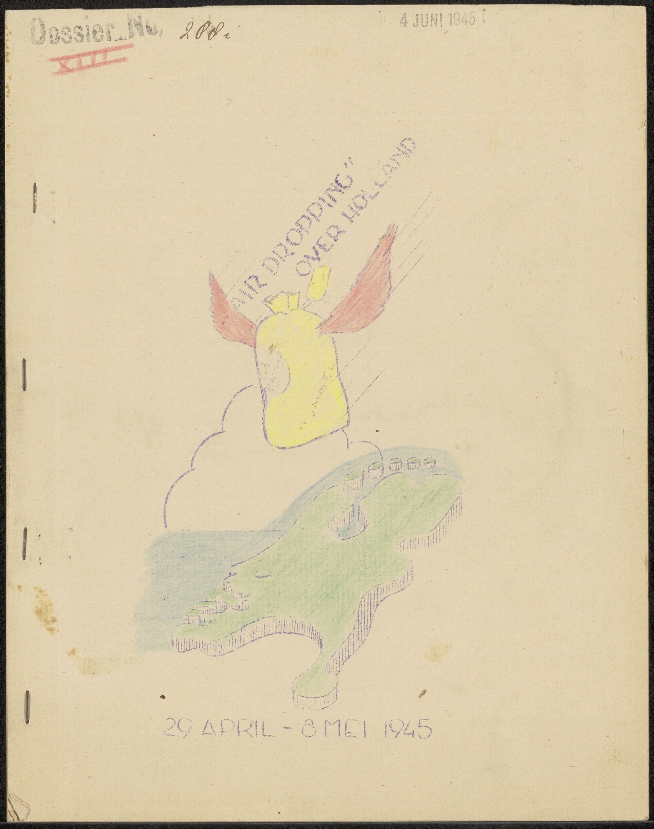 Een zelfgemaakt dossier onder de titel: No. 288, 4 juni 1945 "Air dropping over Holland" 29 april - 8 mei 1945. Op het voorblad een gekleurde potloodtekening van een gele zak met rode vleugels, boven een groene landkaart van Nederland. Het dossier omvat 9 pagina's met 7 bijlagen over onder andere het afwerpen van voedsel voor de bevolking van Utrecht.
