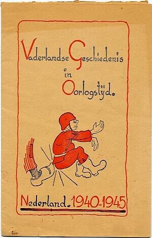 Dubbelgevouwen geïllustreerde boek met een satirische beschrijving van de vaderlandse geschiedenis in oorlogstijd.