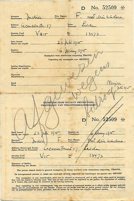 Een in het Engels en Nederlandse voorgedrukte en daarna met pen ingevulde "Vrijstelling van maatregelen t.a.v. Reizen" betreffende F. India. Zij wordt gerechtigd om van 23 juli 1945 tot 6 augustus 1945 met drie kinderen te reizen van Leiden naar Garijp en terug vanwege "ernstige familieomstandigheden". Met potlood staat over de verklaring "Afgewezen wegens bedrog" geschreven.