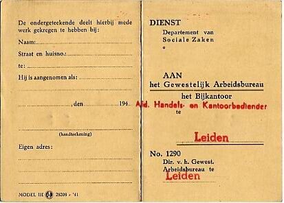 Een "Bewijs van inschrijving" bij het 'Gewestelijk Arbeidsbureau het Bijkantoor te Leiden' met een rood stempel: "Afd. Handels- en Kantoorbedienden" op naam van P. Bok, Rijnsburgerweg 31b te Leiden, van beroep journalist. Afgestempeld op 20 november 1945.