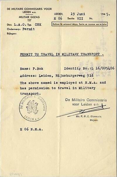 Een voorgedrukte en met schrijfmachine in het Engels ingevulde "Permit to travel in Military Transport" van 19 juni 1945 waarin "De Militaire Commissaris voor Leiden e. o., Mr. F.P.E. Bloemarts, Majoor", P. Bok toestaat te reizen in militair transport vanwege zijn werk bij de N.M.A.