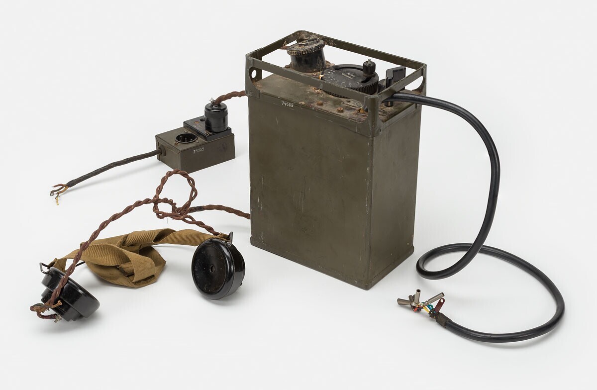 Een Engelse militaire radio-ontvanger: "Wireless set No. 38 MK 2 Z.A. 13280 M.W. Serial No. 156657" bestaande uit een metalenkast met bovenop enkele knoppen en voorzien van een dik snoer. Hierbij hoort een set koptelefoons met een schakelkastje.