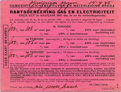 Drie gebruikte GEB-kaarten van de Gemeente Lichtbedrijven en Waterleiding te Breda. Op de kaarten is met de hand het rantsoen voor gas en elektriciteit geschreven.