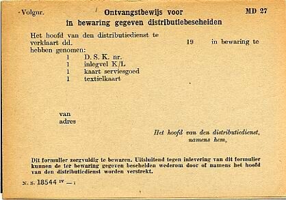 Drievoudig blanco "Ontvangstbewijs voor in bewaring gegeven distributiebescheiden”, met ertussen twee carbon bladen.