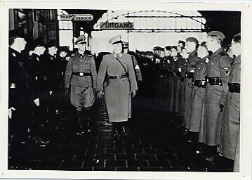 Een zwart-wit foto van een militaire inspectie van de Ambulance-troep op het perron van Den Haag. Op het perron staat ook een rij NSB’ers. <br><br><br><br><br>