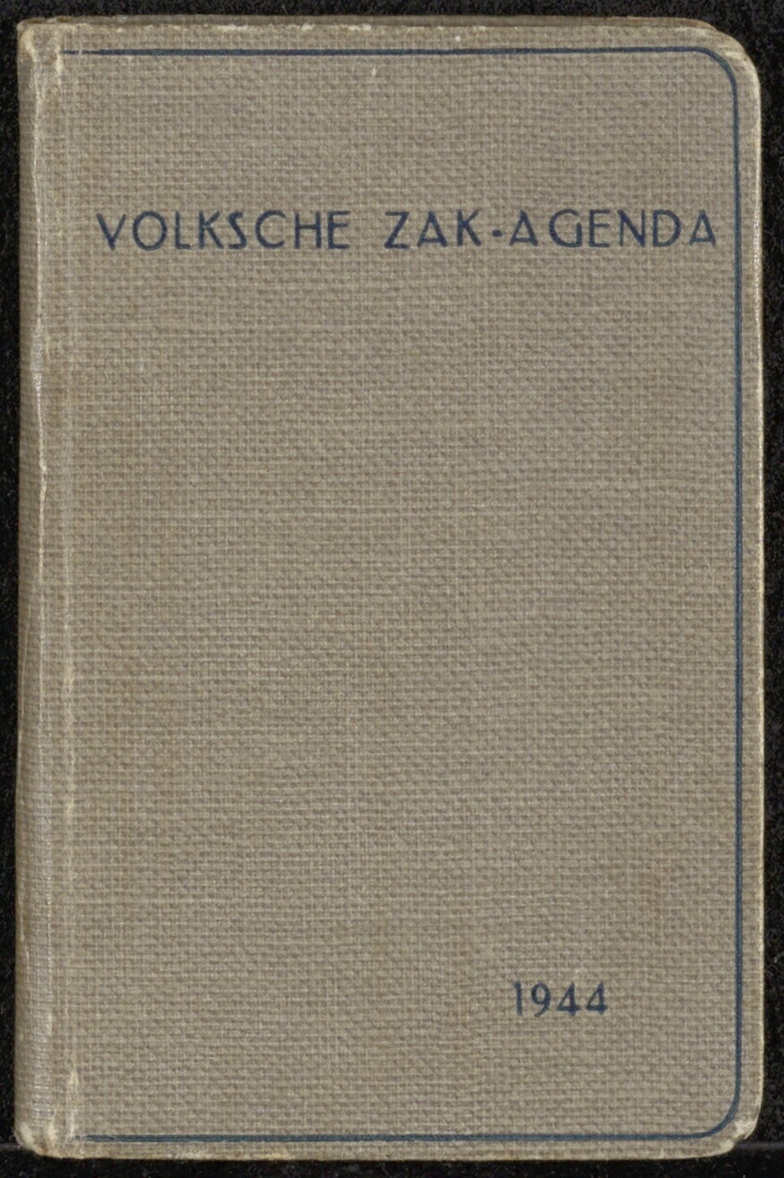 Een "Volksche Zak-Agenda voor 1944". De agenda telt 192 pagina's en heeft een harde grijsblauwe kaft met blauwe opdruk. In de agenda onder meer data gerelateerd aan verjaardagen van bekende kopstukken uit de nationaalsocialistische beweging.