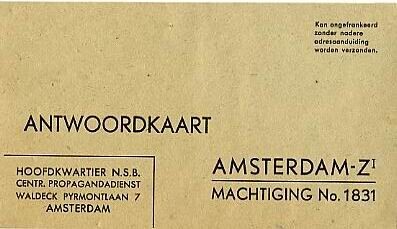 Twee grijze antwoordkaarten van het "Hoofdkwartier N.S.B. Centr. Propagandadienst Waldeckpyrmontlaan 7 Amsterdam". De kaart dient onder andere voor het opvragen van informatie over de N.S.B.<br>