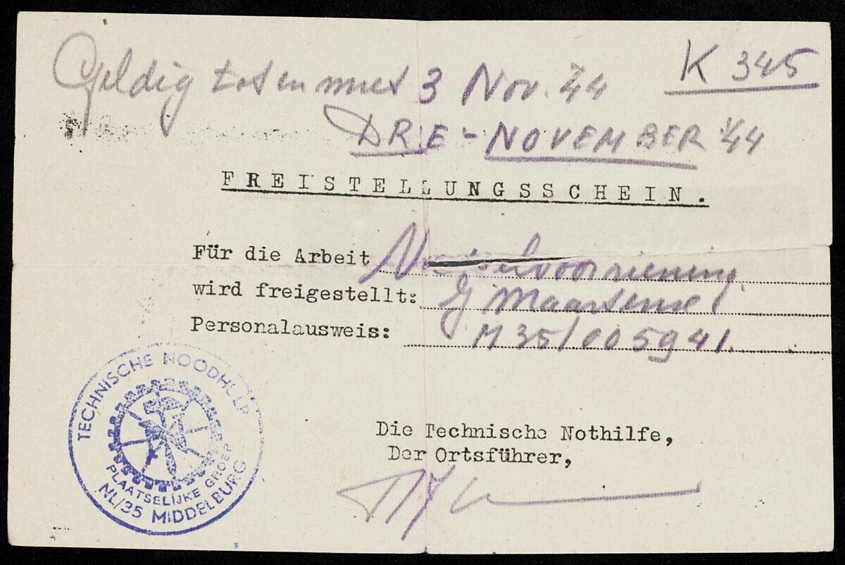 Verklaring van vrijstelling voor arbeid afgegeven door de technische noodhulp Middelburg.