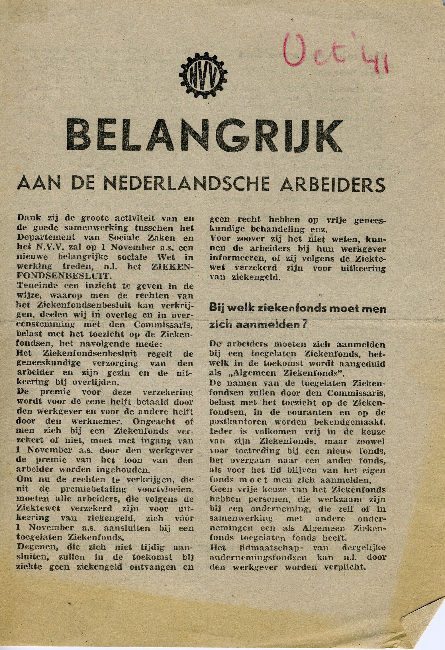 Gedrukt stooibiljet van de N.V.V, aan de Nederlandsche arbeiders in verband met aanmelding voor ziekenfondsen.