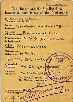 Identiteitskaart Binnenlandsche Strijdkrachten, ten name van F.D.L. Roodschild-Koning no.103. De tekst is in het Nederlands en Engels. Uitgereikt: 18-7-1945.