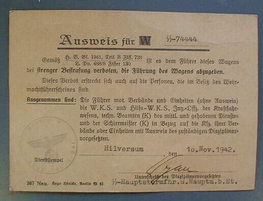 Een in het Duits gestelde en in gotisch schrift gedrukte "Ausweis" voor een voertuig: SS-74444 voorzien van dienststempel met rijksadelaar en hakenkruis afgegeven te Hilversum op 10 november 1942.