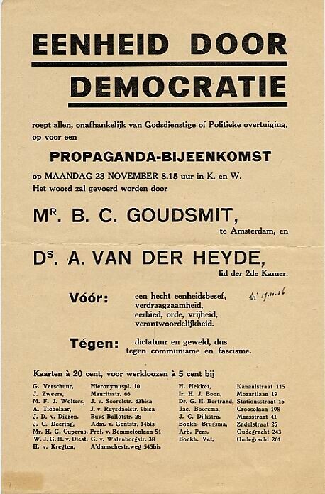 Pamflet voor een 'propaganda-bijeenkomst' van de Nederlandsche Beweging voor Eenheid door Democratie.