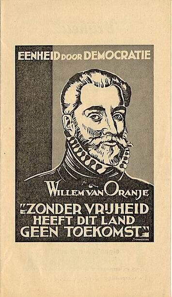 Twee folders van de Nederlandsche Beweging voor Eenheid door Democratie met aan de voorzijde een afbeelding van Willem van Oranje.