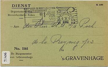 Grijsgroene oproepkaart van de gemeente Den Haag om te verschijnen in het gebouw van de Haagse dierenentuin voor het in ontvangst nemen van de vergoeding voor het inleveren van metalen. De oproep is op naam van de heer Van der Poel.