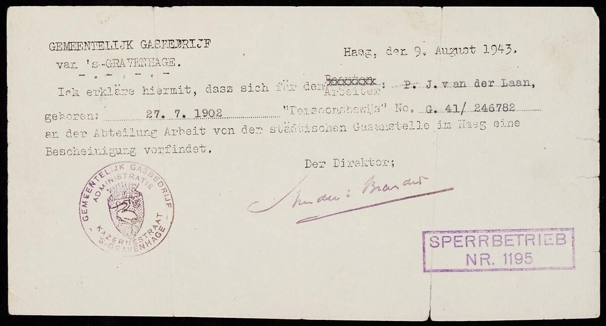 Twee verklaringen van het Gemeentelijk Gasbedrijf van Den Haag op naam gesteld van P.J. van der Laan waarin hij verlof heeft om zich voor zijn werk op straat te begeven ook al is dat voor de burgerbevolking op dat moment verboden. De daarbij horende mouwband die hij droeg is ingeschreven onder: 65708 (1/3) b.