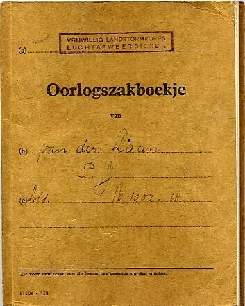 Een "Oorlogszakboekje" met bruine kaft op naam van soldaat P.J. van der Laan met een stempel van het 'Vrijwillig Landstormkorps Luchtafweerdienst".