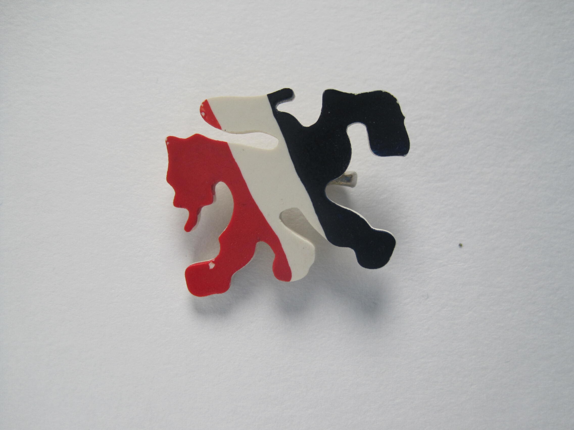 Een reversspeldje van kunststof met de voorstelling van een klimmende Nederlandse leeuw waarop diagonaal de kleuren van de Nederlandse vlag zijn aangebracht. Op de achterkant is verticaal een veiligheidsspeld bevestigd.<br>