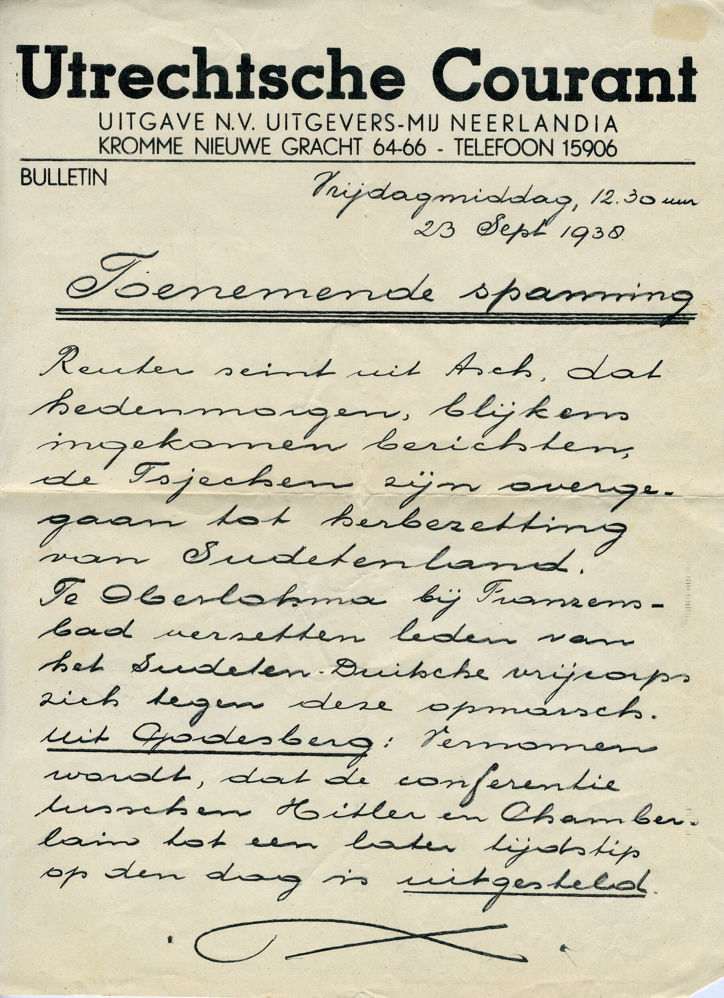 Middageditie van de Utrechtse Courant in schrijfschrift gedrukt over de toenemende spanning in Tsjechië.