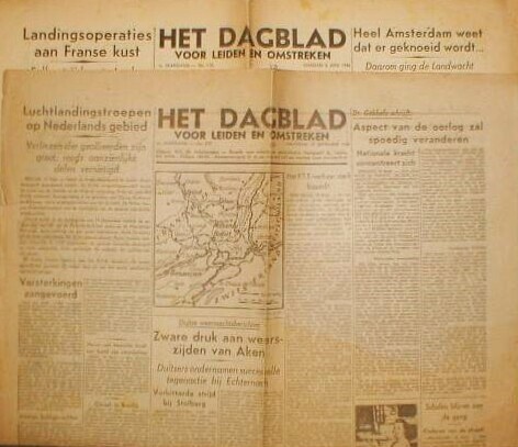 Twee exemplaren van 'Het Dagblad voor Leiden en omstreken'. Het betreft de eerste jaargang, nummer 130 van 6 juni 1944 en nummer 219 van 18 september 1944.