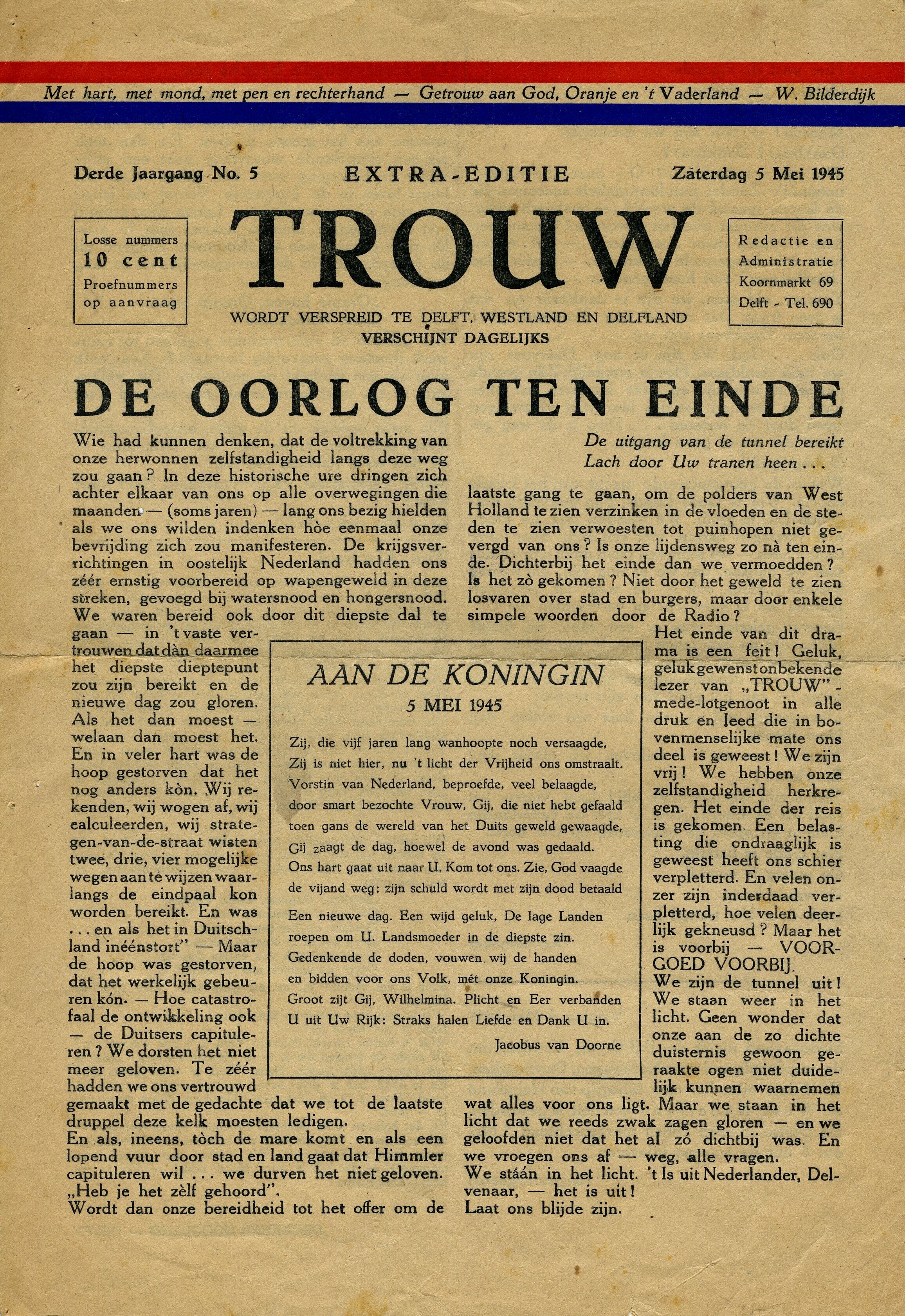 Extra dubbelzijdige editie van Trouw voor Delft, Westland en Delfland. Het artikel betreft de bevrijding en de feestvreugde die dit tot gevolg heeft.