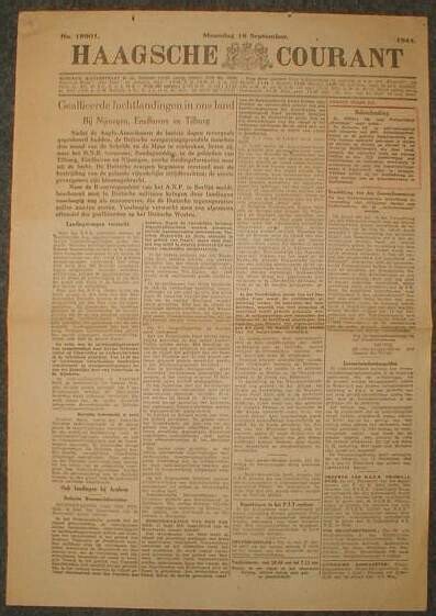 Eén pagina van de Haagsche Courant, nummer 18901 van maandag 18 september 1944 met als hoofdartikel: "Geallieerde luchtlandingen in ons land. Bij Nijmegen, Eindhoven en Tilburg''. Met rood potlood is een bekendmaking omkaderd, waarin wordt gemeld dat op straat rondhangende, lanterfantende mannen tussen de 16 en 50 jaar worden opgepakt en overgebracht zullen worden naar het tewerkstellingskamp te Amersfoort.