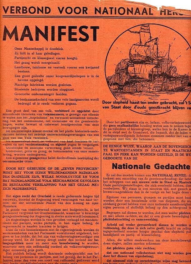 Drie oranje pamfletten van het Verbond voor Nationaal Herstel. Twee ervan in twee verschillende uitvoeringen. Hierop een embleem van een 17e eeuws zeilschip.