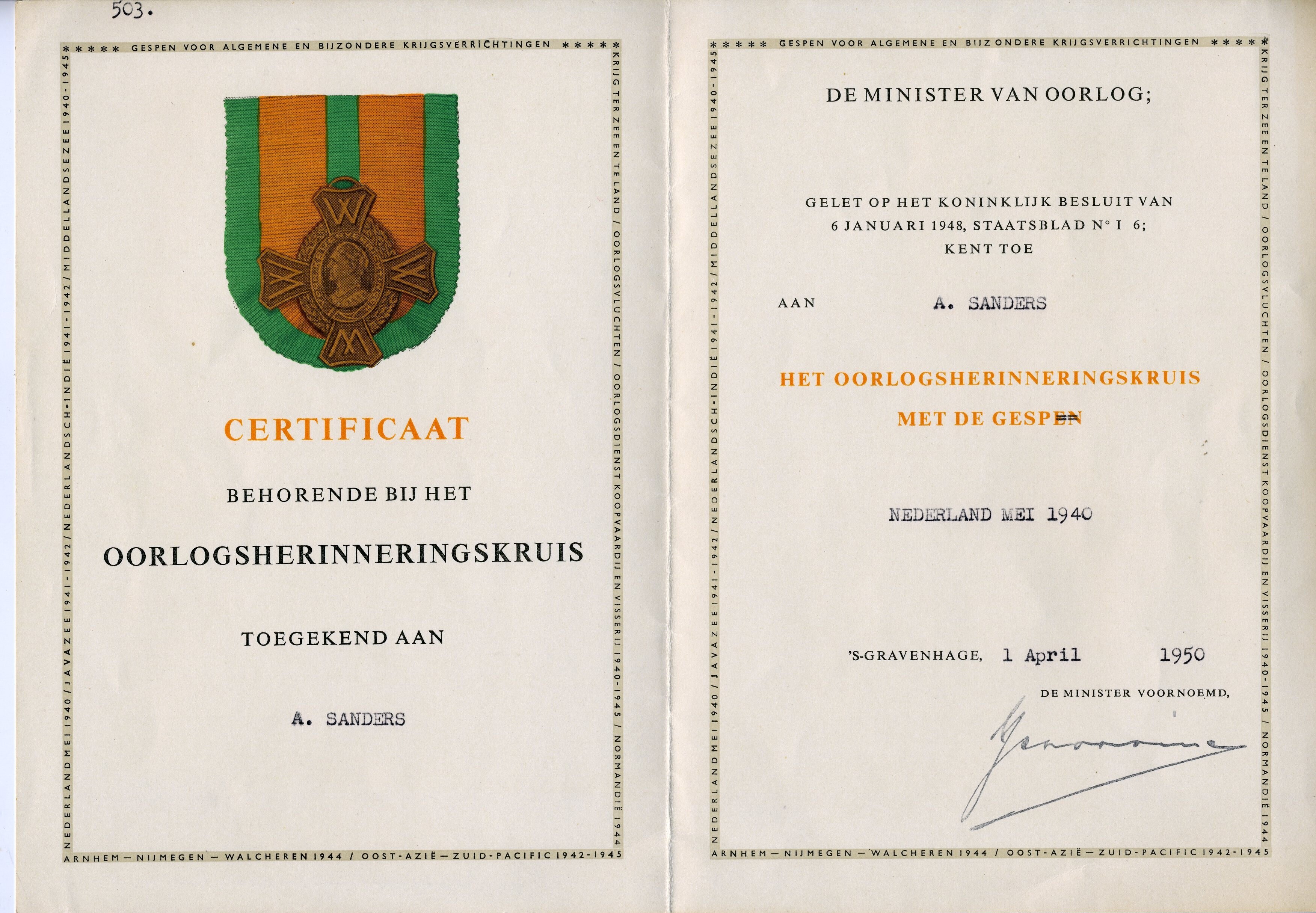 Het certificaat behorend bij het oorlogsherinneringskruis met gesp. De onderscheiding is uitgereikt op 1 april 1950 aan A. Sanders.
