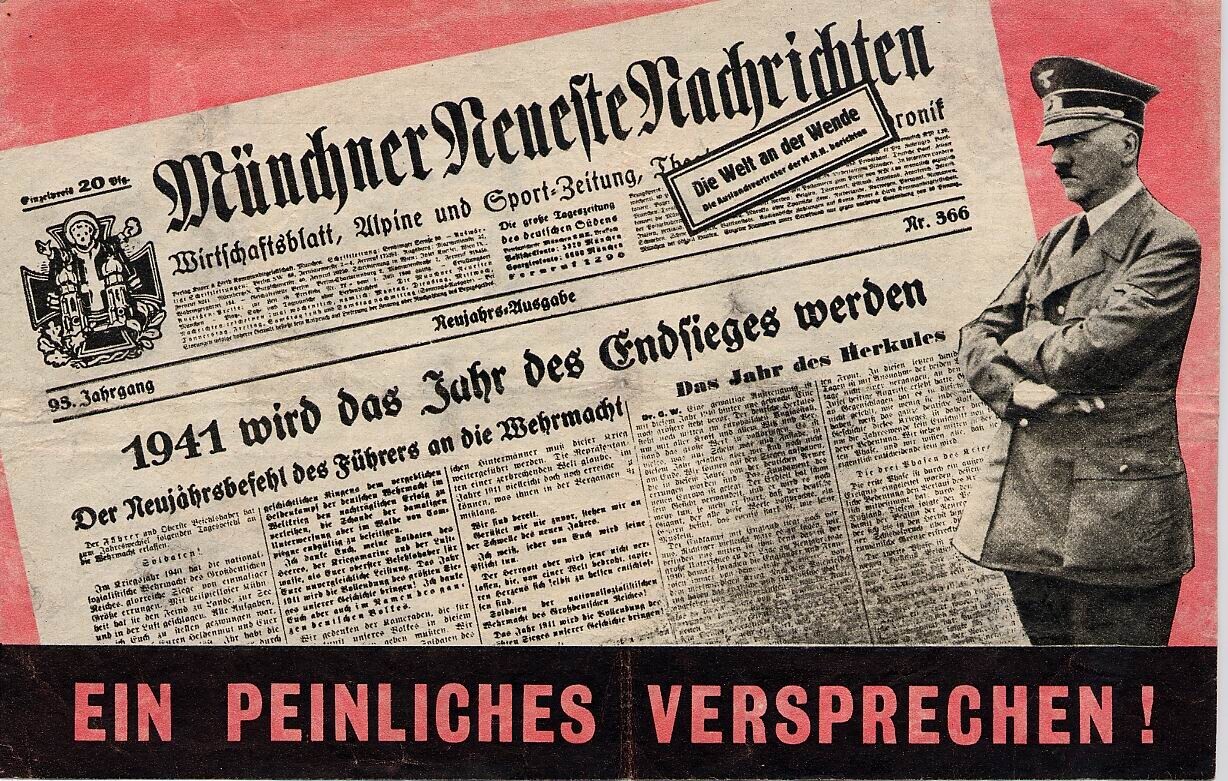 Geallieerd (Duitstalig) pamflet waarin Hitler wordt herinnerd aan zijn grootspraak met betrekking tot de Duitse militaire 'successen' tijdens de inval in de Sovjet-Unie in 1941. Op de voorzijde van het strooibiljet een foto van Hitler. Op de achterzijde verschillende data met citaten vanuit het Führerhauptquartier met als achtergrond een foto van gesneuvelde soldaten.