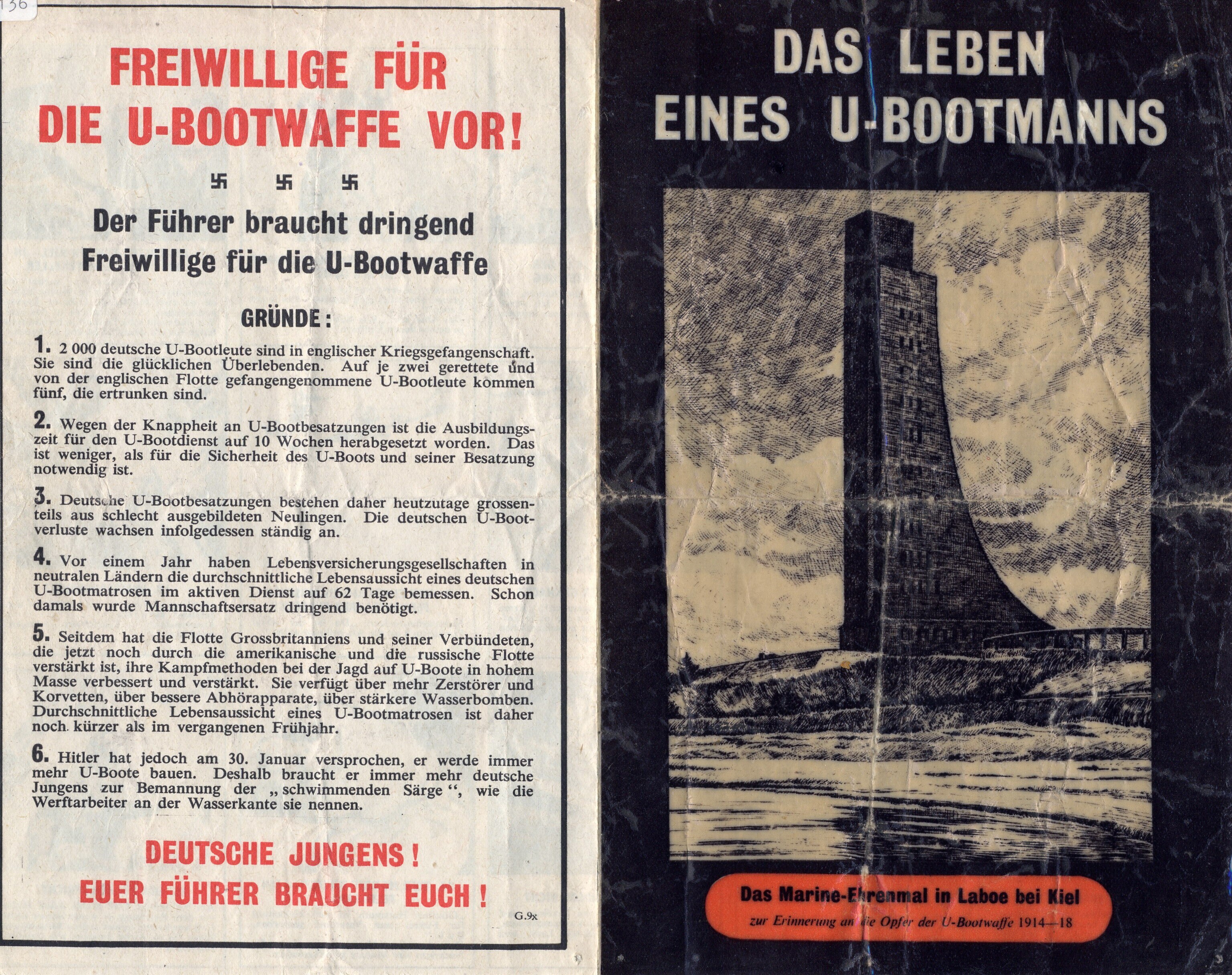 Geallieerd (Duitstalig) pamflet waarin Duitse jongens worden gewaarschuwd voor de risico's die het varen op een onderzeeboot met zich meebrengt.