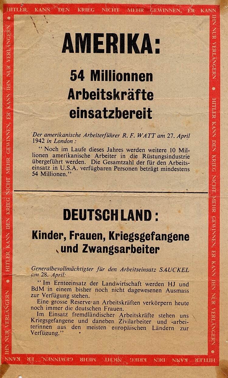 Twee exemplaren van een geallieerd (Duitstalig) pamflet waarin de Amerikaanse en Duitse industriële capaciteit met elkaar wordt vergeleken. Ludendorffs "Kriegserinnerungen" worden aangehaald om de huidige situatie te vergelijken met de situatie ten tijde van de Eerste Wereldoorlog.