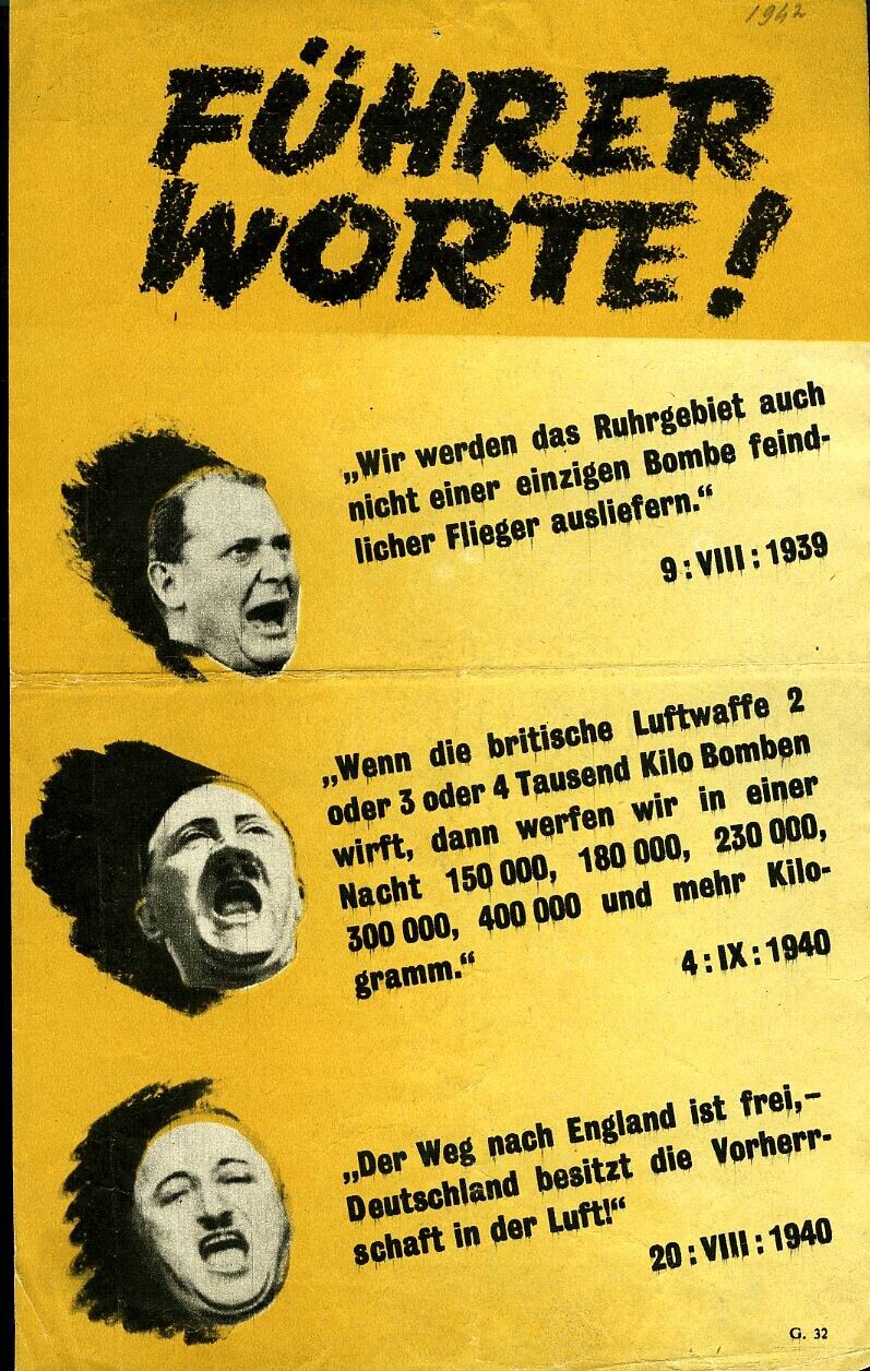 Geallieerd (Duitstalig) pamflet. Op de voorzijde wordt grootspraak van nazileiders met betrekking tot de luchtoorlog geciteerd. Op de achterzijde worden de Duitsers aangemoedigd om zich van Hitlers regime te bevrijden.