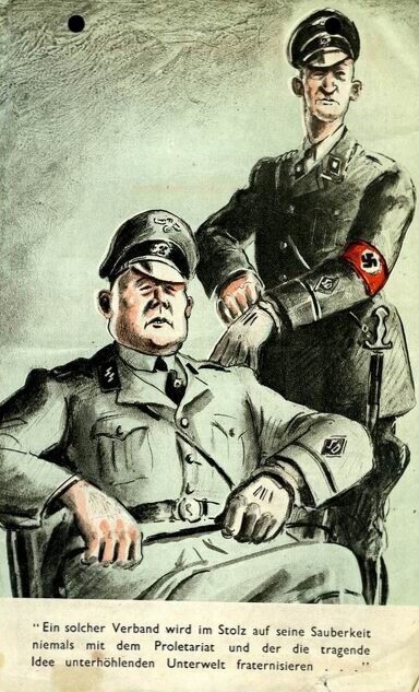 Geallieerd (Duitstalig) pamflet waarin gesproken wordt over een 'vrijbrief' die Hitler zou hebben gegeven aan de S.S. Op de voorzijde een kleurentekening van twee S.S. militairen.