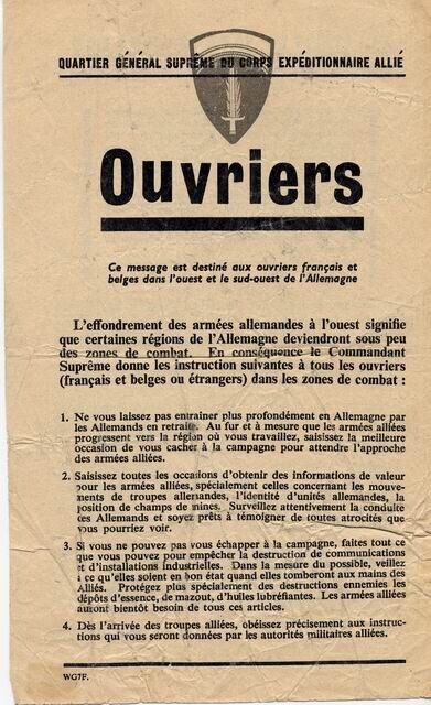 Geallieerd pamflet in twee talen (Frans en Duits) waarin dwangarbeiders instructies krijgen over hoe ze dienen te handelen bij nadering van de geallieerde troepen.