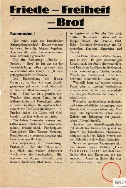 Geallieerd (Duitstalig) pamflet waarin Duitse krijgsgevangenen hun kameraden berichten over het leven in Canada.