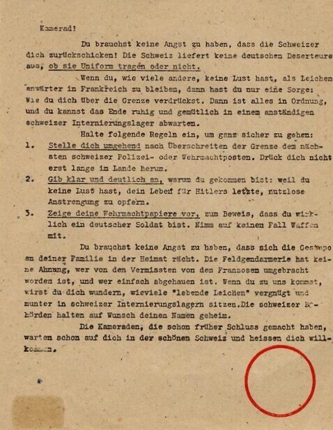 Twee exemplaren van een geallieerd (Duitstalig) pamflet waarin Duitse soldaten in Frankrijk het advies krijgen om te deserteren en in Zwitserland toevlucht te zoeken.