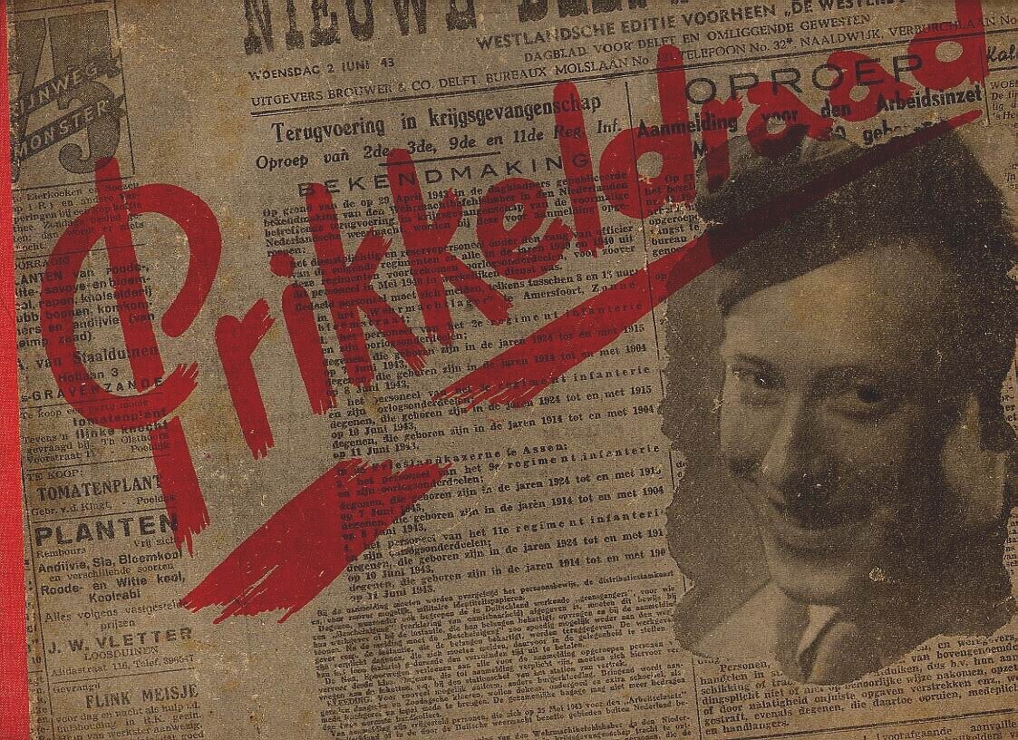 Twee exemplaren van het boek ''Prikkeldraad'' met op de voorkant een foto van een soldaat. In rode opdruk schuin over een afbeelding van een deel van een krant de titel. In het boek verhalen van en over krijgsgevangenen.