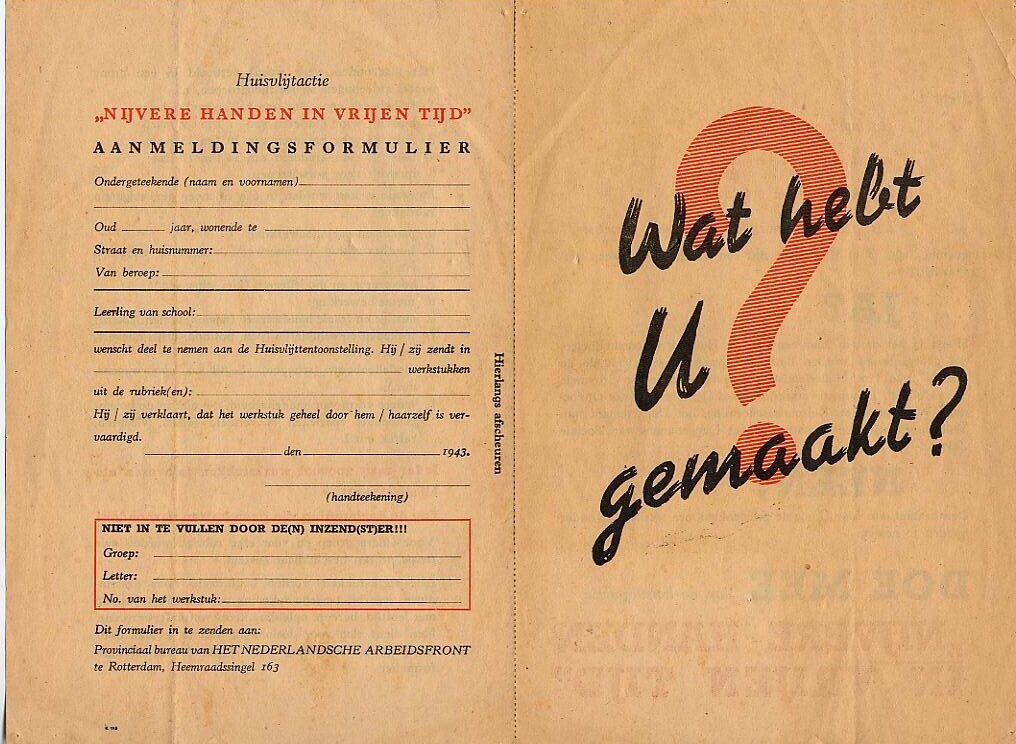 Folder van het Nederlandsche Arbeidsfront waarin wordt aangespoord tot het verrichten van huisvlijt. Op de achterzijde een invulformulier ter aanmelding voor de actie "Nijvere handen in vrijen tijd". Tevens kan worden aangegeven of men wenst deel te nemen aan de Huisvlijttentoonstelling.