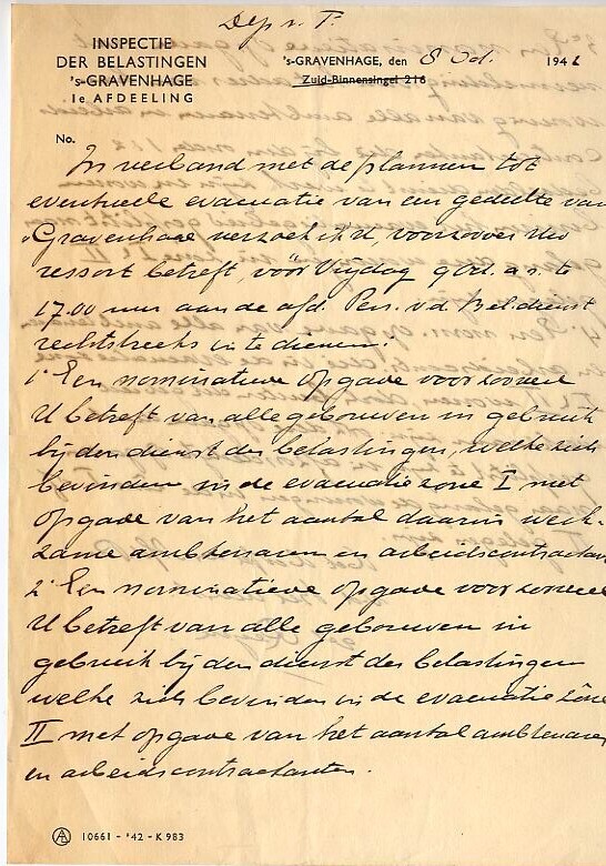 Handgeschreven brief van de Inspectie der Belastingen over de mogelijke evacuatie van een gedeelte van Den Haag.